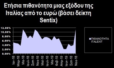 Η πιθανότητα μιας εξόδου της Ιταλίας από την Ευρωζώνη μέσα στους επόμενους 12 μήνες εκτινάχθηκε τον Μάρτιο από το 3,93% στο 11,29%. Την πιθανότητα αυτή βγάζουν Γερμανοί οικονομολόγοι και αναλυτές βάσει του δείκτη Sentix.