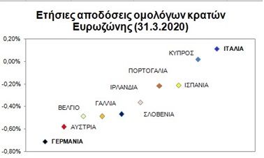 Η Γερμανία όπως και η Αυστρία και η Ολλανδία δανείζονται πολύ φτηνά από τις αγορές μέσω των ομολόγων τους. Μάλιστα σήμερα ένας επενδυτής που θα αγοράσει γερμανικά ομόλογα λήξης σε ένα έτος, ήτοι το 2021 και κρατήσει το ομόλογο ως τη λήξη του θα... "απολαύσει" αρνητική απόδοση ήτοι -0,71%.