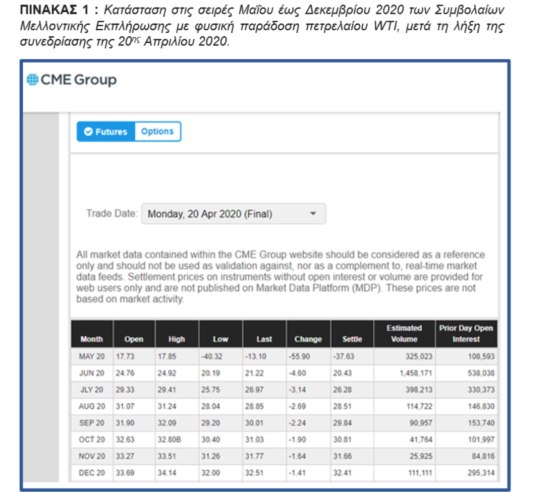 Ήταν ημέρα Δευτέρα, 20 Απριλίου 2020 που είχε οριστεί ως η τελευταία μέρα διαπραγμάτευσης της σειράς συμβολαίων φυσικής παράδοσης για πετρέλαιο West Texas Intermediate (WTI), βαθμού crude oil, δηλαδή σχετικά χαμηλής πυκνότητας και χαμηλής περιεκτικότητας σε θείο. Εκείνη τη μέρα το συμβόλαιο μελλοντικής εκπλήρωσης άνοιξε στα $17,73, έκανε χαμηλό στα $-40,32 και η εκκαθάριση έγινε στα $-37,63. Πριν το άνοιγμα οι ανοιχτές θέσεις ήταν 108,593 συμβόλαια και ο όγκος που έγινε από το άνοιγμα μέχρι το τέλος ήταν περίπου 325,000 συμβόλαια. Αυτή η μέρα πέραν τον μεγάλων ζημιών που εγγράφηκαν, χωρίς λόγο όπως θα δούμε παρακάτω, είναι ίσως η μέρα που θα αναφέρεται στα πανεπιστήμια κάτι όπως η ""διαπραγμάτευση" "Βαρουφάκη"" (τα πολλά εισαγωγικά δεν τα έβαλα στην τύχη).