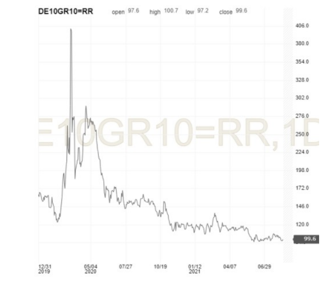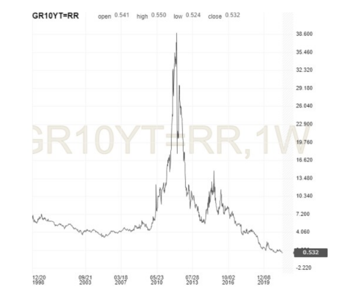 Η απόδοση του αντίστοιχου γερμανικού ομολόγου Bund, που θεωρείται ένα από τα ασφαλέστερα επενδυτικά "καταφύγια” στον κόσμο, βρίσκεται στο -0,46%, με αποτέλεσμα το spread (δηλ. η "ψαλίδα” μεταξύ αυτού και του ελληνικού ομολόγου) να βρίσκεται στις 0,99% (99 μονάδες βάσης), δηλαδή κάτω και από το "ψυχολογικό φράγμα" του 1% (γράφημα 2). Αυτά είναι επίπεδα που πρωτοεμφανίζονται μετά από μία δεκαετία και πλέον, οπότε και ξεκίνησε η παγκόσμια χρηματοπιστωτική κρίση με την πτώχευση της Lehman Brothers το 2008 και την κρίση χρέους της Ευρωζώνης στη συνέχεια.