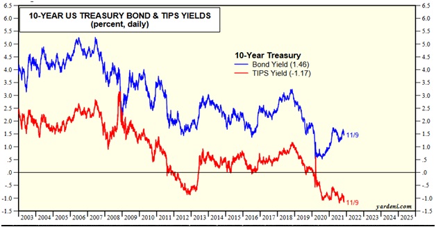 Αυτό σημαίνει ότι οι ομολογιούχοι ουσιαστικά πληρώνουν το αμερικάνικο Δημόσιο -και δεν πληρώνονται από αυτό- για να αγοράσουν το κρατικό του Χρέος. Δεδομένου του ιλιγγιώδους αμερικάνικου Χρέους, του πληθωρισμού και της μακράς διάρκειας των δεκαετών ομολόγων, το αρνητικό πραγματικό επιτόκιο που προσφέρουν είναι σχεδόν παράλογο. Με δεδομένο, λοιπόν, ότι χρυσός και ομόλογα "παλεύουν” για μια θέση στα επενδυτικά χαρτοφυλάκια, η πτώση της πραγματικής απόδοσης των ομολόγων κάνει θεωρητικά την αγορά και διακράτηση χρυσού πιο ενδιαφέρουσα.