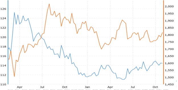 Η τιμή του Χρυσού παραδοσιακά εκφράζεται σε Δολάρια. Με όλες τις υπόλοιπες παραμέτρους σταθερές, κάθε κίνηση του Δολαρίου προκαλεί θεωρητικά αντίθετη κίνηση του Χρυσού. Με απλούστερα λόγια, όταν το Δολάριο είναι αδύναμο, ο Χρυσός δυναμώνει. Αυτό συμβαίνει διότι όταν το αμερικάνικο νόμισμα πέφτει, χρειάζονται περισσότερα Δολάρια για την αγορά μίας ουγγιάς Χρυσού και έτσι η -εκφραζόμενη σε USD- τιμή του ανεβαίνει "αυτόματα”. Εννοείται ότι όταν το Δολάριο κερδίζει έδαφος, λειτουργεί ως "βαρίδι” στην ονομαστική τιμή του Χρυσού.