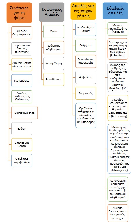 Η κλιματική κρίση επηρεάζει πλέον κάθε χώρα σε κάθε ήπειρο. Διαταράσσει τις εθνικές οικονομίες και επηρεάζει τις ζωές μας, ενώ έχει σημαντικές επιπτώσεις στους ανθρώπους, τις κοινότητες και τα κράτη. Σύμφωνα με την Ευρωπαϊκή Επιτροπή αναγνωρισμένες συνέπειες υπάρχουν στο φυσικό περιβάλλον αλλά και σημαντικές απειλές για τον άνθρωπο, τις κοινωνίες, τις επιχειρήσεις. Παρακάτω παρουσιάζεται πίνακας με τις γνωστές και αναγνωρισμένες συνέπειες και απειλές για τις οποίες τα κράτη καλούνται να ενεργήσουν και να προετοιμαστούν.