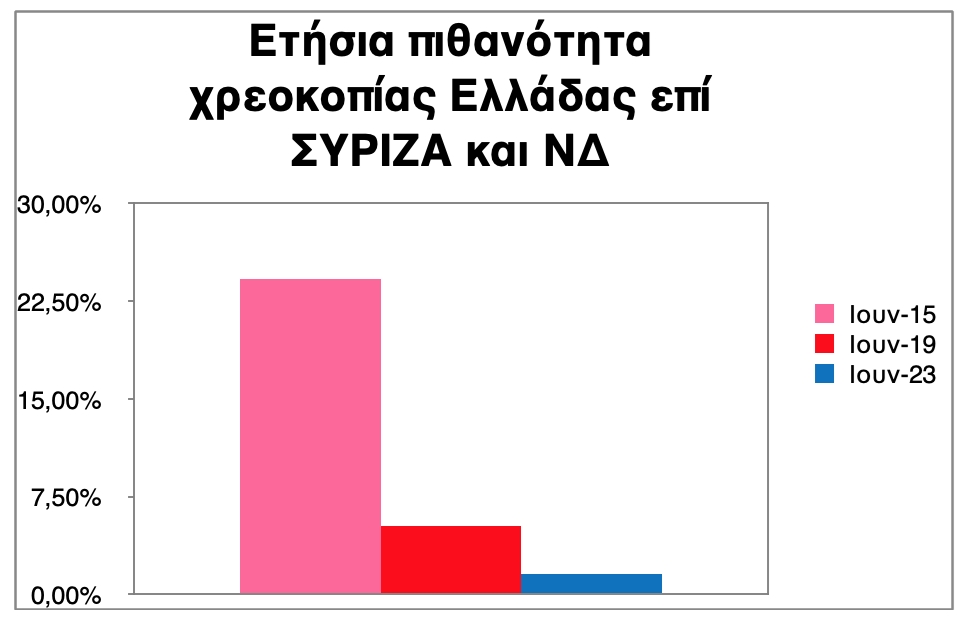 Η μείωση της αβεβαιότητας και του κινδύνου χρεοκοπίας επί γαλάζιας διακυβέρνησης ήταν αξιοσημείωτη. Σύμφωνα με τις τιμές των ασφαλίστρων κινδύνου χρεοκοπίας (CDs) και των αποδόσεων του 5ετούς κρατικού ομολόγου της χώρας μας, η πιθανότητα χρεοκοπίας της Ελλάδας εντός ενός έτους (12 μηνών) έπεσε στο 1,53% από 5,27% που ήταν τον Ιούνιο του 2019. Επί διακυβέρνησης Τσίπρα η πιθανότητα χρεοκοπίας ήταν μεγαλύτερη λόγω μεγαλύτερης αβεβαιότητας. Μάλιστα βάσει των αποδόσεων των 5ετών κρατικών ομολόγων τον Ιούνιο του 2015 η πιθανότητα χρεοκοπίας εντός ενός έτους ανερχόταν στο πρωτόγνωρο 24,22%!