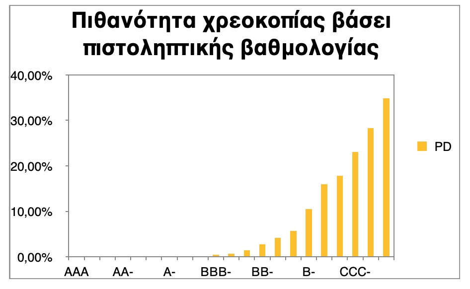 Η ετήσια πιθανότητα χρεοκοπίας ίση με 1,5% περίπου (1,46% για την ακρίβεια) αντιστοιχεί σε μία βαθμίδα ΒΒ. Οι οίκοι Fitch και Standard & Poor’s κατατάσσουν την Ελλάδα στη βαθμίδα ΒΒ+ σήμερα, δηλαδή δίνουν πιθανότητα χρεοκοπίας 0,72%.