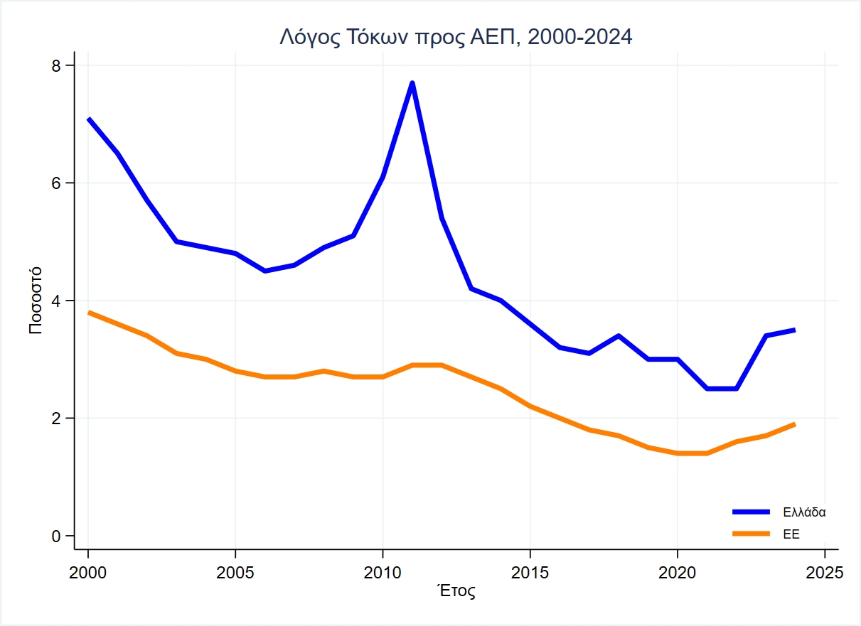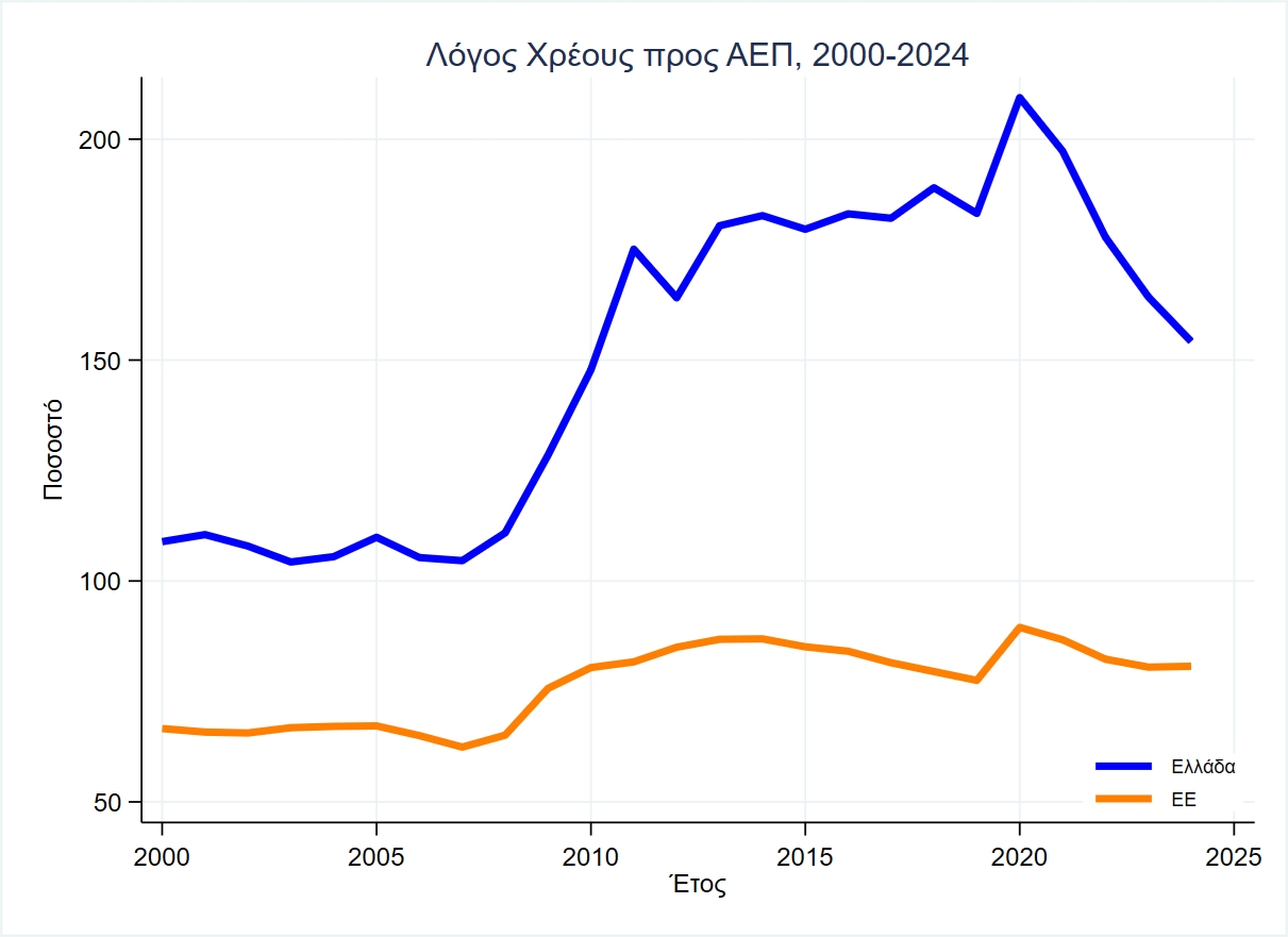 Ο λόγος εθνικού χρέους προς ΑΕΠ (ΕΧ-Α) είναι μία σημαντική οικονομική στατιστική που εμφανίζεται συχνά στο δημόσιο διάλογο. Για τις περισσότερες ανεπτυγμένες χώρες, ο λόγος αυτός έχει καταγράψει ιστορικά υψηλά, και η τροχιά που διαγράφει είναι αυστηρά αύξουσα. Ενδεικτικά, ο δείκτης αυτός για την Ελλάδα αυξάνεται μέχρι και το 2020 όπου καταγράφεται και η μέγιστη τιμή που έχει λάβει, ενώ τα επόμενα έτη παρατηρούμε σταθερή μείωση. Το 2024, ο δείκτης ΕΧ-Α για την χώρα μας ξεπέρασε το 154%, σχεδόν διπλάσια τιμή από τον αντίστοιχο λόγο για την Ευρωπαϊκή Ένωση (μέσο εθνικό χρέος προς μέσο ΑΕΠ). Στο παρακάτω διάγραμμα βρίσκεται ο δείκτης ΕΧ-Α για την Ελλάδα και την Ευρωπαϊκή Ένωση.