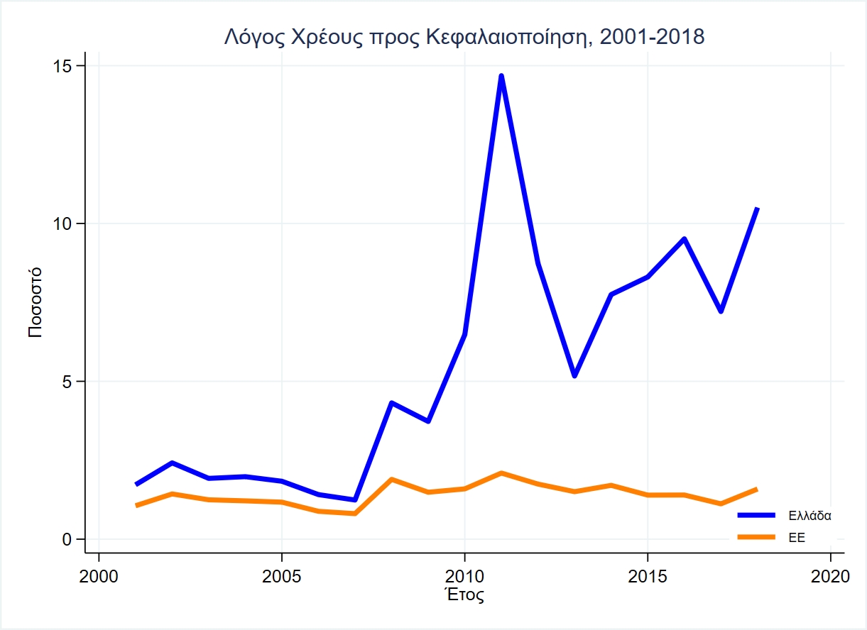 Τα παραπάνω συμβαδίζουν, εν πολλοίς, με τα συμπεράσματα που θα μπορούσαμε να εξάγουμε από τον δείκτη ΕΧ-Α, τουλάχιστον μέχρι την περίοδο της Ελληνικής κρίσης. Ωστόσο η συσσώρευση του χρέους κυριαρχεί μετά την έναρξη της κρίσης, καθιστώντας δύσκολη την εξαγωγή συμπερασμάτων για την έκθεση της χώρας μετά την πτώχευση της χώρας το 2015. Εστιάζοντας στον δείκτη εθνικού χρέους προς συνολική κεφαλαιοποίηση, μπορούμε να εικάσουμε ότι ο πλούτος της οικονομίας σταδιακά αυξάνεται με χαμηλότερο ρυθμό απ’ ό,τι απαιτείται για να συμβαδίσουμε με την τάση της ΕΕ, κάτι που δύναται να απειλήσει την πιστοληπτική ικανότητα της Ελλάδας στο μέλλον.