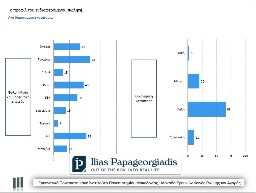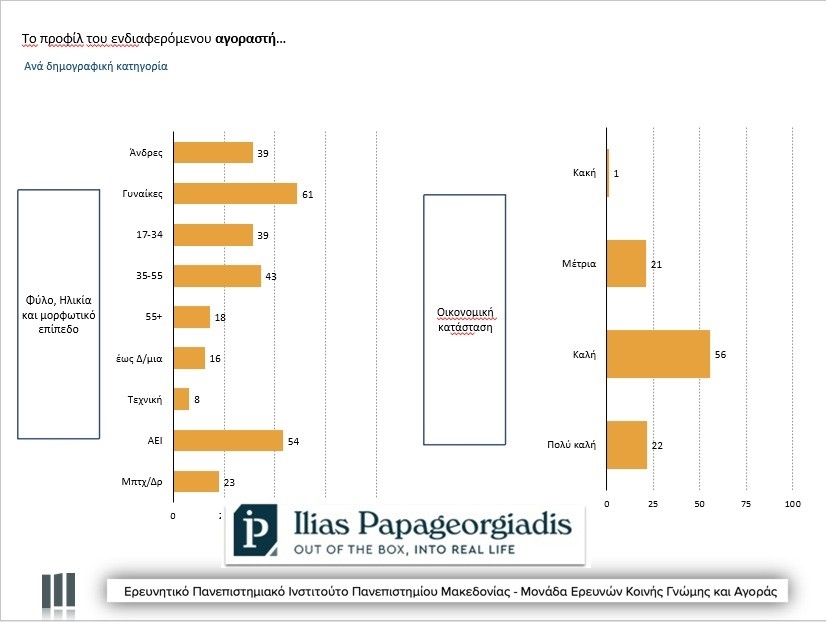 Περίπου 4 στους 5 αγοραστές δηλώνουν πως είναι άνετοι οικονομικά, κάτι που συμβαδίζει και με τα ποσοστά αυτών που έχουν καλές σπουδές (στοιχείο που σύμφωνα με τους ειδικούς είναι ένδειξη μεγαλύτερου διαθέσιμου εισοδήματος).
