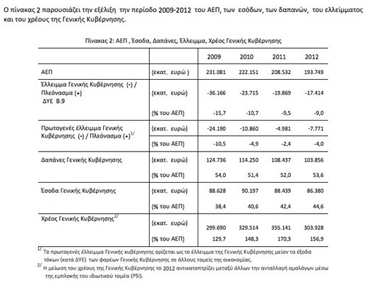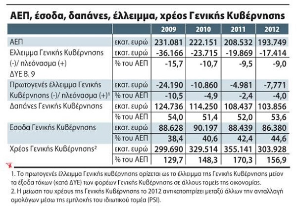 Το 2009 την τελευταία χρονιά πριν τη χρεοκοπία, το ελληνικό κράτος (σε επίπεδο Γενικής Κυβέρνησης) ξόδεψε 124, 7 δισ. ευρώ, ενώ είχε έσοδα 88,6 δισ. ευρώ. Ήτοι, έλλειμμα 36,1 δισ. ευρώ.