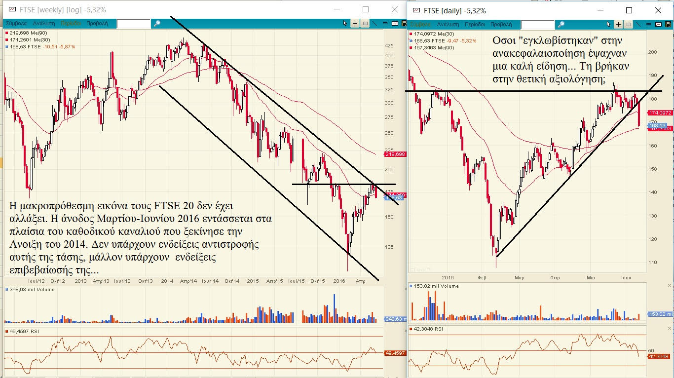 Στο ελληνικό χρηματιστήριο την εβδομάδα που πέρασε είχαμε ανατροπή του σκηνικού. Η άνοδος που ξεκίνησε το περασμένο Μάρτιο είχε σαν σημείο αναφοράς την επιτυχή πρώτη αξιολόγηση. Έστω και με καθυστέρηση λίγες μέρες πριν το Βρετανικό δημοψήφισμα η αξιολόγηση ήρθε, αλλά στην αγορά φαίνεται πως λειτούργησε ο κανόνας αγόρασε στη φήμη και πούλα στην είδηση. Παρά το γεγονός πως υπάρχει στενή συσχέτιση της μεσοπρόθεσμης τάσης του ελληνικού χρηματιστηρίου με τα διεθνή απαρατήρητο δεν μπορεί να περάσει το γεγονός πως η αντιστροφή της ανοδικής τάσης προέκυψε στα επίπεδα τιμών της τελευταίας ανακεφαλαιοποίησης των τραπεζών όπου και εγκλωβίστηκαν οι ξένοι επενδυτές. ΚΣ