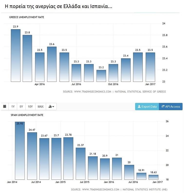 Στην Ελλάδα η ανεργία τους τελευταίους μήνες του 2016 άρχισε να "τσιμπάει" εκ νέου. Στην Ισπανία όπου εκφώνησε την ομιλία του ο πρωθυπουργός, με τις προς ευρωπαίους συμβουλές για το τι πρέπει να κάνουν για να προοδεύσουν οικονομικά, η ανεργία από 27% το 2013 έχει υποχωρήσει πέριξ του 18%. Στην Ισπανία όμως οι "Ποδέμος" ηττήθηκαν και δεν επικράτησαν όπως ο ΣΥΡΙΖΑ στην Ελλάδα.