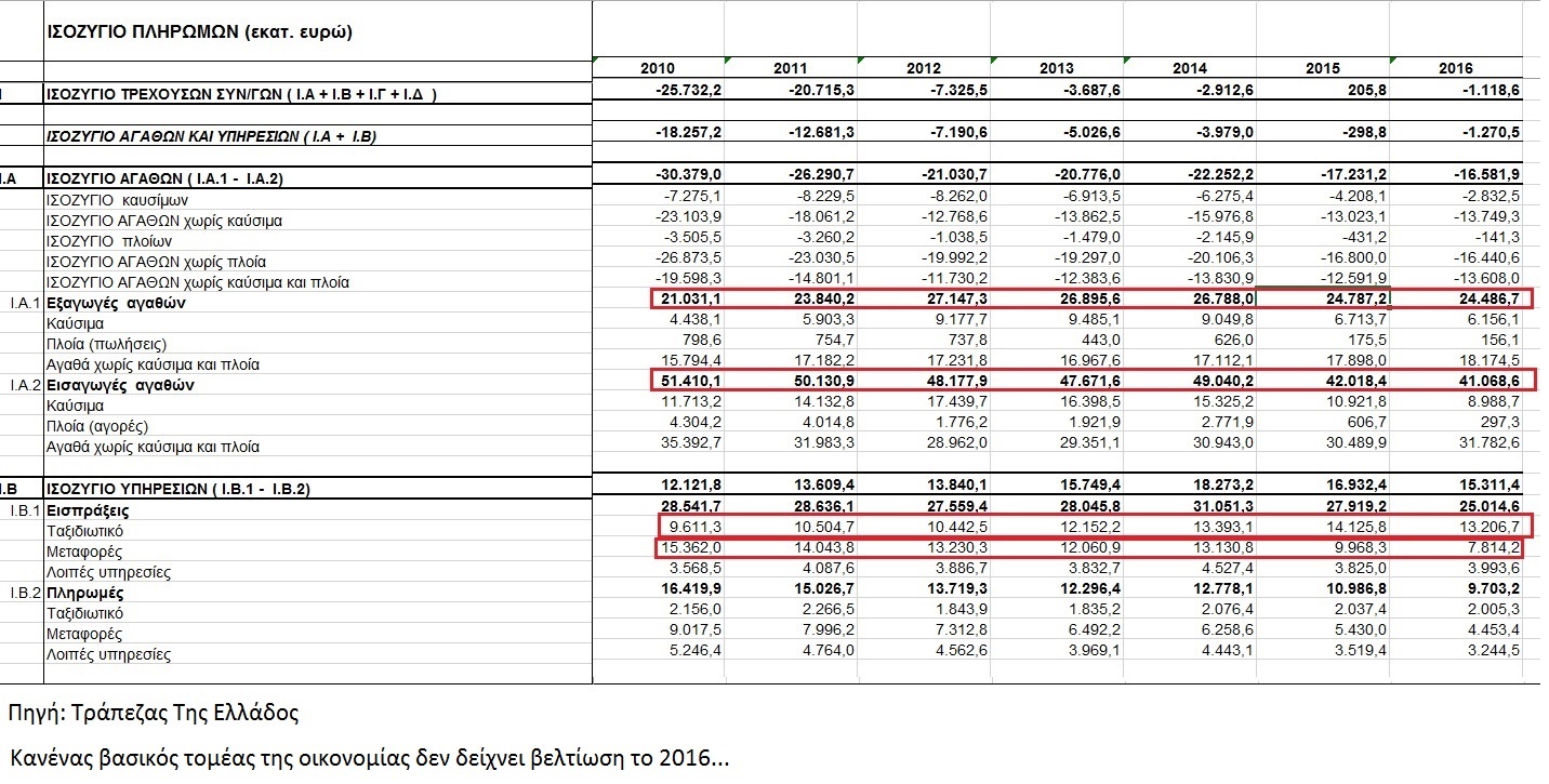 Η Ελλάδα το 2010 είχε έλλειμμα τρεχουσών συναλλαγών 25,7 δισ. ευρώ. Το 2015, χάρη στους Παπανδρέου, Παπαδήμο και Στουρναροσαμαροβενιζέλους το ισοζύγιο τρεχουσών συναλλαγών για πρώτη φορά μετά από δεκαετίες έβγαλε πλεόνασμα αντί για έλλειμμα.
