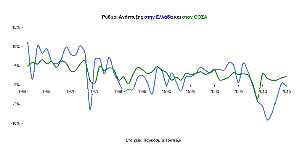 Η Ελλάδα τις δεκαετίες του ‘50-60 και ‘70 είχε μεταβολή του ΑΕΠ κατά μέσο όρο υψηλότερη από το μέσο όρο των χωρών του ΟΟΣΑ. Έτσι φτάσαμε μεταξύ των πλουσιότερων χωρών του κόσμου.