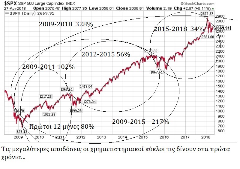 Από τις 670 μονάδες το 2009 (για την ακρίβεια το ενδοημερήσιο χαμηλό έφτασε μέχρι τις 666 μονάδες) ο "Πατριάρχης” των χρηματιστηριακών δεικτών ο S&P 500 το 2018 έφτασε μέχρι και τις 2.900 μονάδες, άνοδος πάνω από 320%.