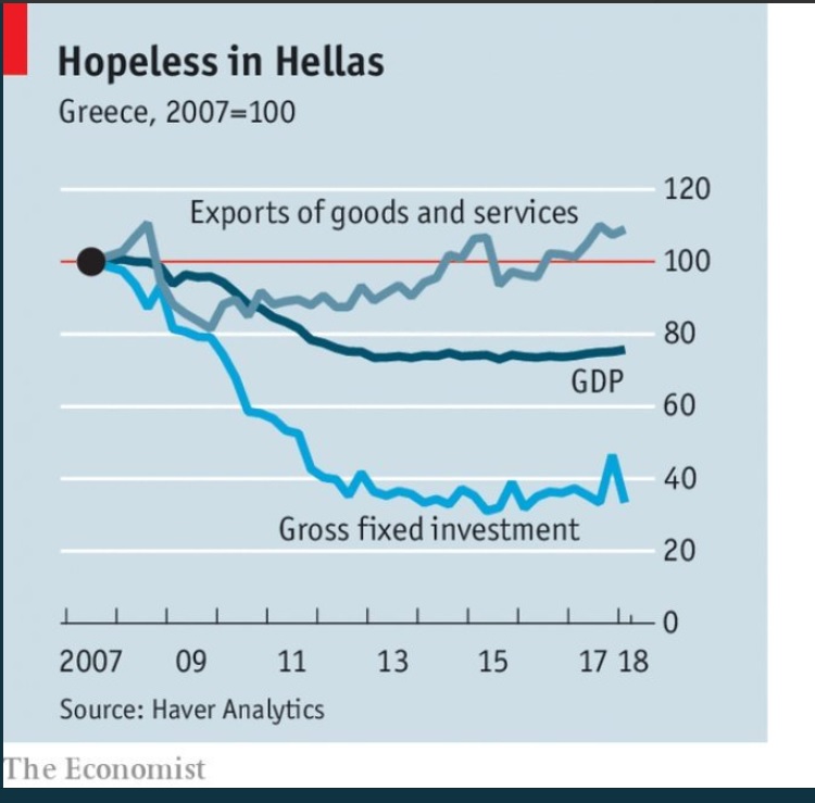 Αυτός που θέλει να κάνει μια επένδυση στην Ελλάδα δεν βλέπει απλώς τα θηριώδη αχρείαστα πλεονάσματα αλλά βλέπει πως αυτά δεν προέρχονται από μια οικονομία που καλπάζει αλλά μια οικονομία που είναι σε στασιμότητα.