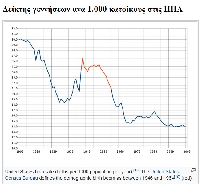 Η μεταπολεμική δημογραφική έκρηξη αποτυπώνεται κυρίως με την αύξηση του δείκτη γεννήσεων στις ΗΠΑ (αλλά και τη Δ. Ευρώπη) από 19 σε 29 γεννήσεις ανά 1000 κατοίκους μεταξύ 1940 με 1960.