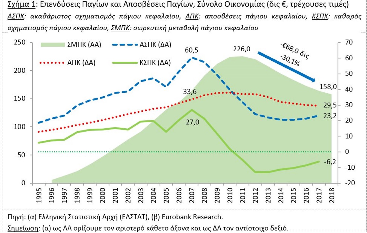 "Το συσσωρευμένο πάγιο κεφάλαιο της ελληνικής οικονομίας το 2018 ήταν μειωμένο κατά -€68,0 δισ. σε σύγκριση με το 2011.