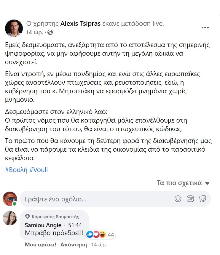 Μετά το αίτημα για επέκταση των χωρικών υδάτων στα 12 μίλια, ο κ. Τσίπρας δεσμεύεται για την κατάργηση του νέου πτωχευτικού κώδικα ενώ συμπαθούσα αοιδός στα κοινωνικά δίκτυα τον επικροτεί κάτωθεν στις ανάρτησης με ένα "Μπράβο Πρόεδρε!".