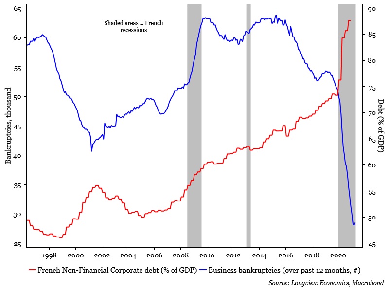 Όπως δείχνει το παρακάτω γράφημα στην περίπτωση της Γαλλίας (κάτι που ισχύει για όλες τις οικονομίες) αντί των 50-60.000 χρεοκοπιών επιχειρήσεων που είχαμε κατά μέσο όρο τα τελευταία χρόνια, πέρυσι είχαμε κάτω από 30.000...