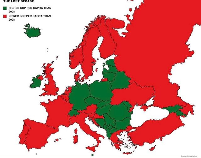 Οι χώρες που έχουν σήμερα υψηλότερο κατά κεφαλήν εισόδημα από το 2008, τη χρονιά του Διεθνούς Χρηματοπιστωτικού Κραχ, είναι κυρίως αυτές της Ανατολικής Ευρώπης που κατάφεραν να καλύψουν μέρος της υστέρησης που τους είχε καταδικάσει η "Κομμουνιστική Κατοχή". Από τις χώρες της Δυτικής Ευρώπης μόνο η Γερμανία, η Αυστρία και η Ιρλανδία έχουν καταφέρει να βελτιώσουν τη θέση τους.