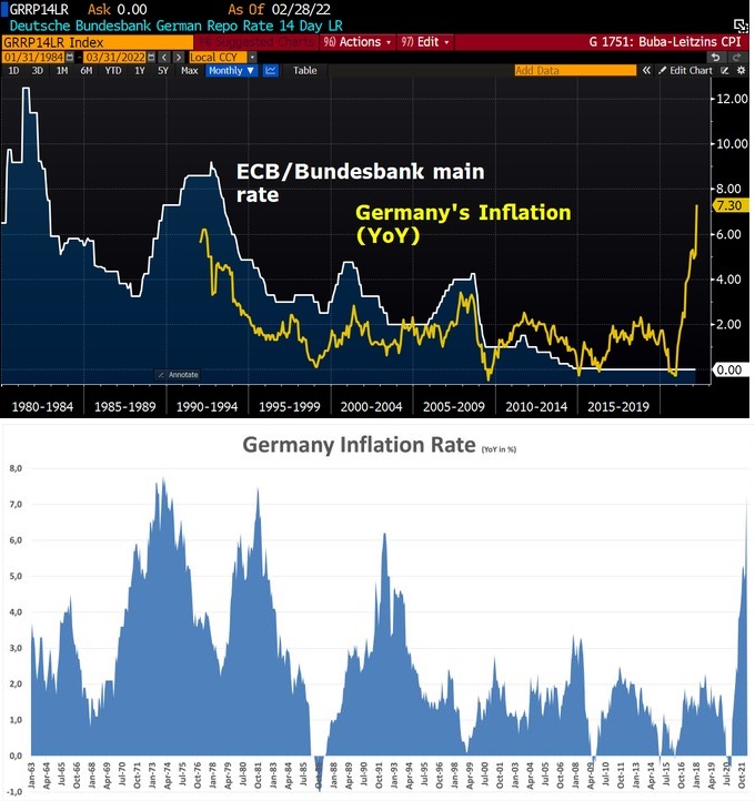 Χθες τα στοιχεία έδειξαν πως ο πληθωρισμός στην πλέον εύρωστη οικονομία της Ε.Ε., τη Γερμανία, έφτασε το 7,3%, στο υψηλότερο σημείο από το 1981. Τότε το βασικό επιτόκιο ήταν πάνω από 11%, σήμερα είναι πέριξ του μηδενός.