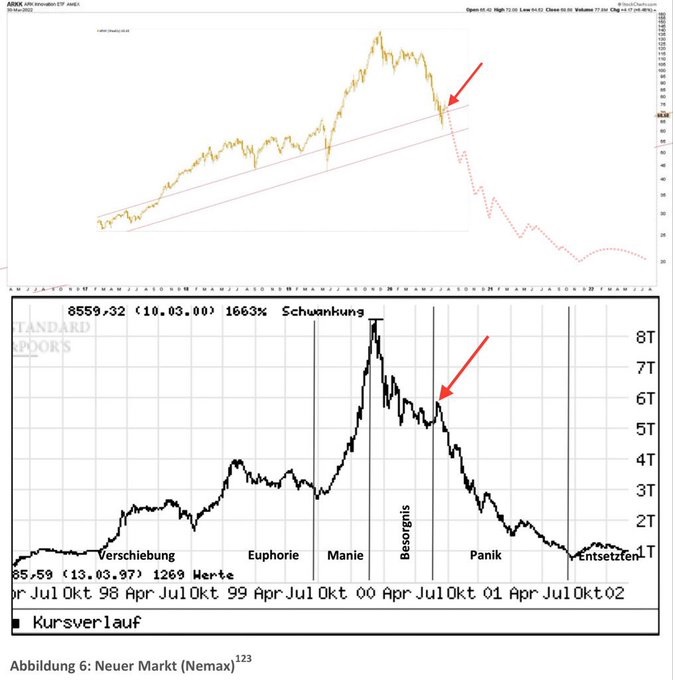 Το ETF ARKK που διαχειρίζεται η διάσημη γκουρού των μετοχών νέων τεχνολογιών Cathie Wood από τα 150 δολάρια έχει προσγειωθεί ήδη κάτω από τα 70. Αν το παραβάλει κάποιος με το ιστορικό μοτίβο που ακολουθούν οι "φούσκες" όταν σκάνε φαίνεται πως ίσως έχει δρόμο ακόμη...