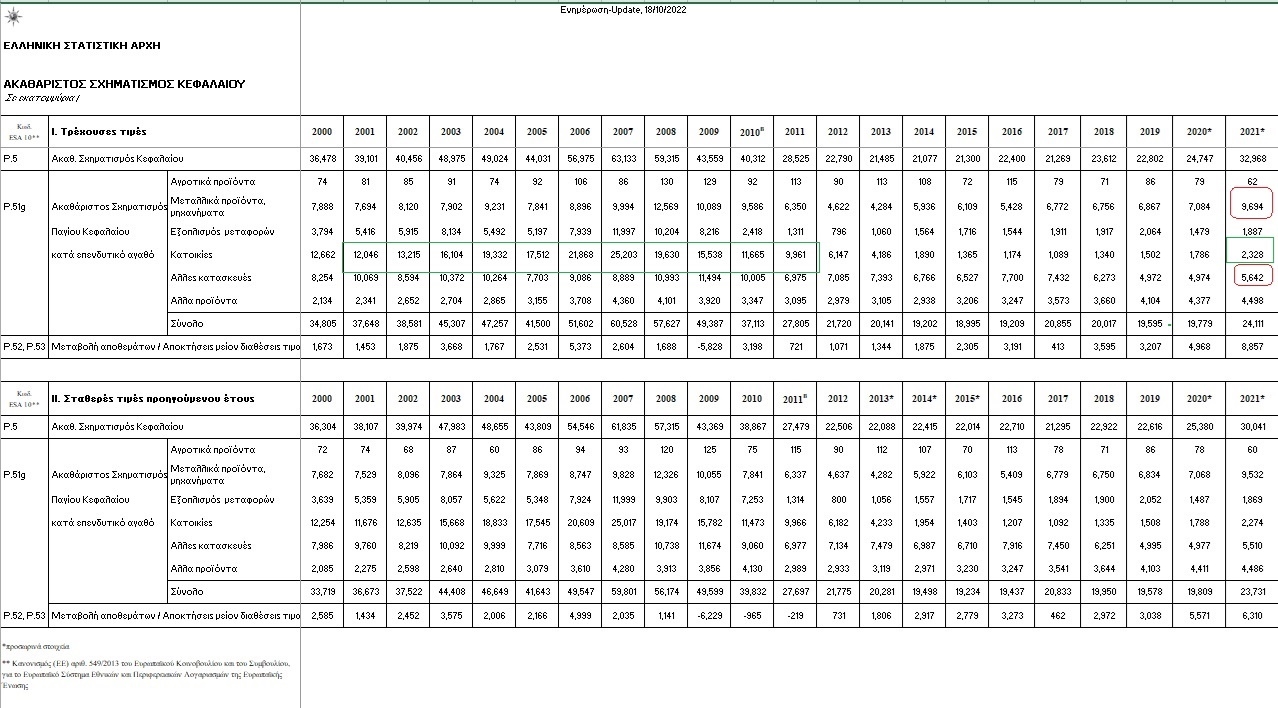 Ιδού λοιπόν τι συμβαίνει με τις επενδύσεις. Ο ακαθάριστος σχηματισμός κεφαλαίου το 2021 έφτασε τα 32,9 δισ. ευρώ από 22,8 δισ. ευρώ το 2019, 21,3 το 2015 και 43,5 δισ. το 2009 την τελευταία χρονιά πριν τη χρεοκοπία.