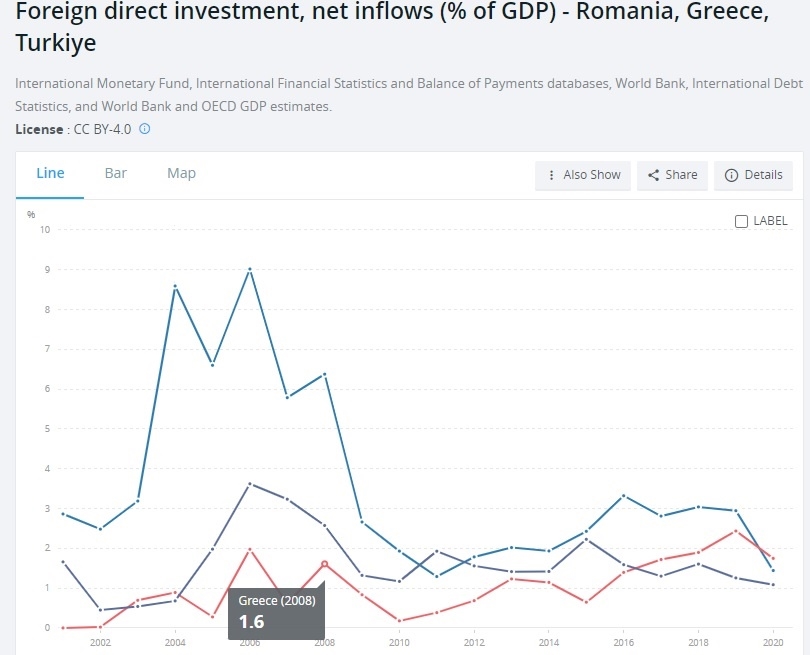 Βλέπε: Foreign direct investment, net inflows (% of GDP) - Romania, Greece, Turkiye