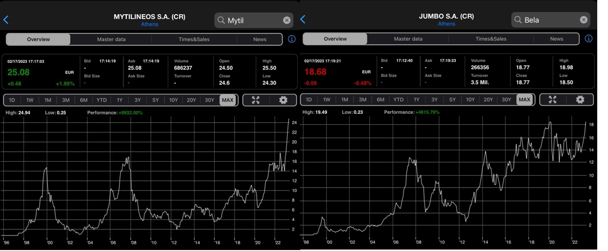 Αν κοιτάξει κάποιος την πορεία των μετοχών των δυναμικών εταιρειών όπως του Μυτιληναίου και της Jumbo, η πορεία τους ταιριάζει περισσότερο με αυτή των μετοχών των διεθνών αγορών. Οι μετοχές βρίσκονται στα ιστορικά υψηλά τους...
