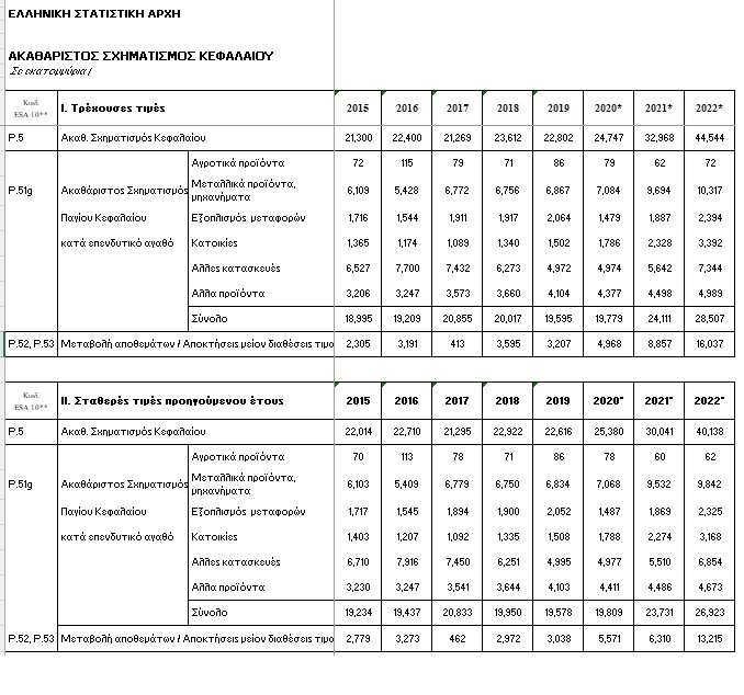Πρόσφατα η ΕΛΣΤΑΤ δημοσιοποίησε τα στοιχεία για τον ακαθάριστο σχηματισμό παγίου κεφαλαίου του 2022 ο οποίος για πρώτη φορά μετά από 12 χρόνια ξεπέρασε τα 40 δισ. ευρώ.