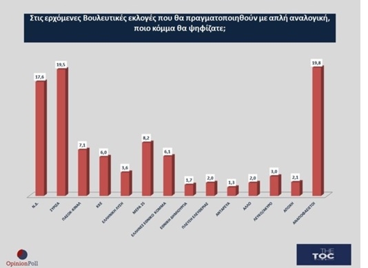 Στην τελευταία δημοσκόπηση της Opinion Poll στην κατηγορία των νεότερων ψηφοφόρων στην πρόθεση ψήφου επί των εγκύρων, ο ΣΥΡΙΖΑ προηγείται της Ν.Δ με 20,5% έναντι 18,5% ( διαφορά 2%).