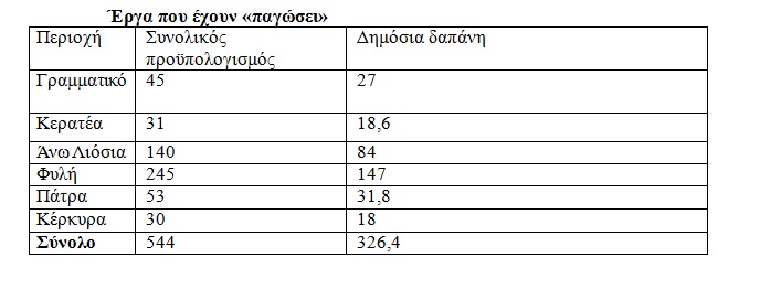 Επομένως, το συνολικό χρηματοδοτικό κενό για την υλοποίηση των έργων που βρίσκονταν σε εξέλιξη, αλλά “πάγωσαν” και των καινούργιων είναι της τάξης των 550 εκατ. ευρώ.