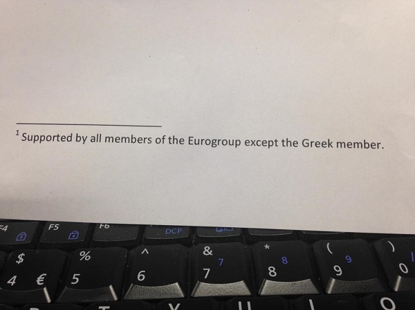 Δυστυχώς, παρά τις προσπάθειες σε όλα τα επίπεδα και την πλήρη στήριξη του Eurogroup, αυτή η πρόταση απορρίφθηκε από τις ελληνικές αρχές, οι οποίες διέκοψαν τις διαπραγματεύσεις αργά το βράδυ της 26ης Ιουνίου μονομερώς. Το Eurogroup υπενθυμίζει τη σημαντική οικονομική βοήθεια και στήριξη που παρείχε τα τελευταία χρόνια. Το Eurogroup ήταν ανοιχτό έως την τελευταία στιγμή να στηρίξει περαιτέρω τον ελληνικό λαό μέσω ενός αναπτυξιακά προσανατολισμένου προγράμματος.