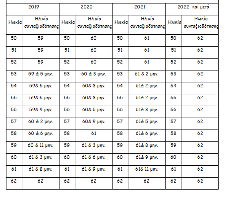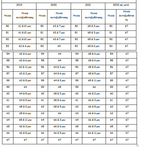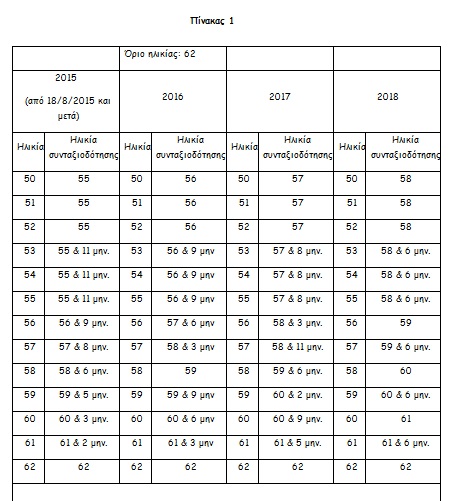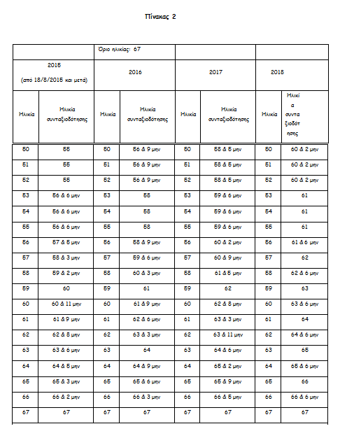 Με βάση τους παρακάτω πίνακες προκύπτουν τα νέα ηλικιακά όρια συνταξιοδότησης στα 62 (πίνακας 1) και τα 67 έτη (πίνακας 2) αντίστοιχα :