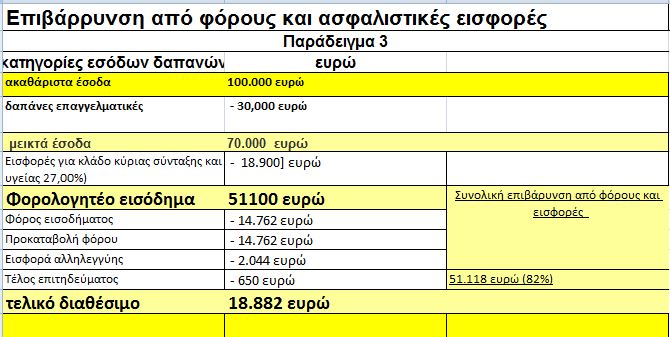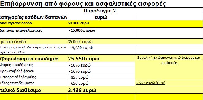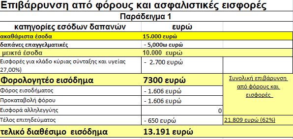Έτσι η συνολική επιβάρυνση από φόρους και εισφορές αυτασφάλισης (π.χ., στον ΟΑΕΕ) για κάποιο επαγγελματία μπορεί να αυξηθεί ακόμα και κατά 44%.