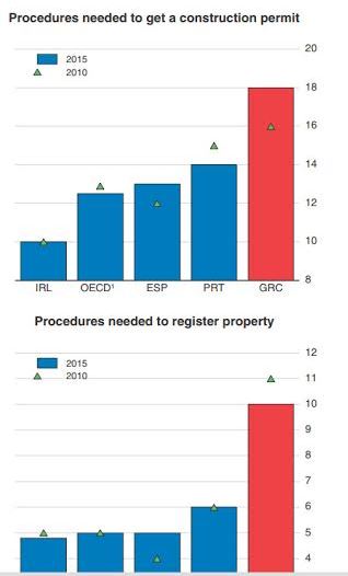 Ωστόσο, σύμφωνα με την έκθεση του ΟΟΣΑ, οι επενδύσεις στο ελληνικό real estate βρίσκονται αντιμέτωπες με την μεγάλη καθυστέρηση στην έκδοση άδειας δόμησης (βλ.πρώτο γράφημα) και την ιδιαίτερα αργή διαδικασία δήλωσης των ακινήτων στο κτηματολόγιο (βλ.δεύτερο γράφημα). Μάλιστα, συγκριτικά με τον μέσο όρο του ΟΟΣΑ, η Ελλάδα είναι η πρωταθλήτρια της...καθυστέρησης ως προς την έκδοση άδειας δόμησης και τη δήλωση των ιδιοκτησιών στο κτηματολόγιο.