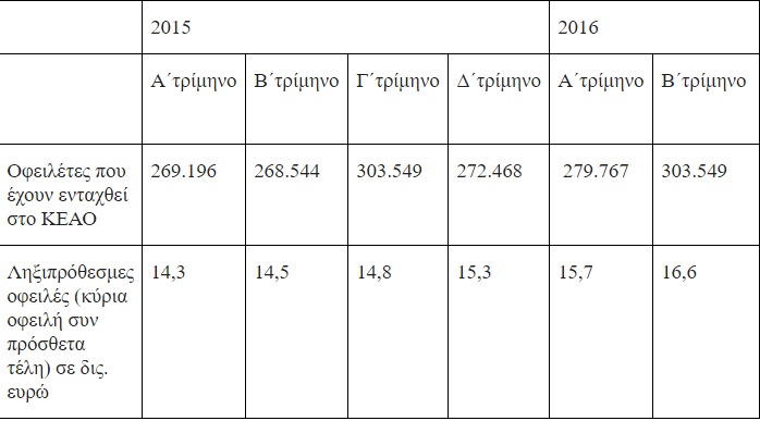 Συγκεκριμένα, τα ληξιπρόθεσμα χρέη προς τα Ταμεία (σ.σ. αφορούν οφειλές άνω των 5.000 κατ΄ άτομο) αυξήθηκαν στο τέλος του Ιουνίου του 2016 στα 16,6 δισ. ευρώ έναντι των 15,7 δισ. ευρώ που ήταν στο τέλος Μαρτίου 2016. Παράλληλα οι οφειλέτες που εντάχθηκαν στο ΚΕΑΟ αυξήθηκαν από τους 269.196 το α΄ τρίμηνο του 2015 στους 303.549 το β’ τρίμηνο του 2016 (αύξηση 34.353 ή 11%).