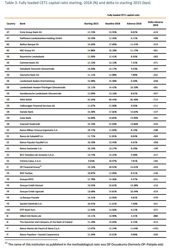 Η ιταλική Monte dei Paschi (η τρίτη μεγαλύτερη της χώρας και η παλιότερη τράπεζα του κόσμου), η αυστριακή Raiffeisen, η ισπανική Banco Popular και δύο από τις βασικές ιρλανδικές τράπεζες είχαν τα χειρότερα αποτελέσματα σε σύνολο 51 τραπεζών απ' όλη την Ευρώπη, πλην Ελλάδας και Πορτογαλίας.