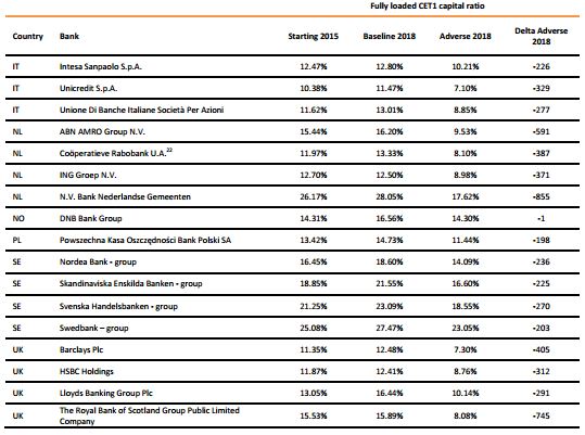Υπό το δυσμενές σενάριο, η μέση μείωση κεφαλαίου ήταν 3,9 ποσοστιαίες μονάδες, δηλαδή υψηλότερη σε σχέση με τις 2,6 ποσοστιαίες μονάδες στο πλαίσιο της άσκησης του 2014. Αυτό οφείλεται εν μέρει στο γεγονός ότι για την άσκηση του 2016 χρησιμοποιήθηκε αυστηρότερη μεθοδολογία και δυσμενέστερο σενάριο το οποίο αφορούσε και πάλι ορίζοντα τριετίας και χρησιμοποιούσε στατικούς ισολογισμούς. Χάρη σε υψηλότερα επίπεδα κεφαλαίου και άλλες βελτιώσεις από το 2014 και μετά, ο τελικός μέσος δείκτης CET1 υπό το δυσμενές σενάριο ήταν ωστόσο υψηλότερος στο 9,1%, έναντι 8,6% το 2014.
