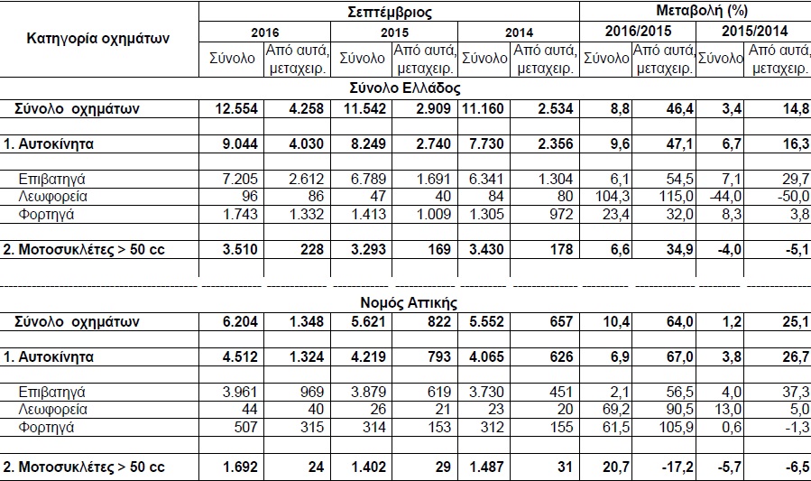 Τα καινούργια αυτοκίνητα που κυκλοφόρησαν την περίοδο Ιανουαρίου - Σεπτεμβρίου 2016 ανέρχονται σε 67.778 έναντι 62.236 που κυκλοφόρησαν την αντίστοιχη περίοδο του έτους 2015, παρουσιάζοντας αύξηση 8,9%.