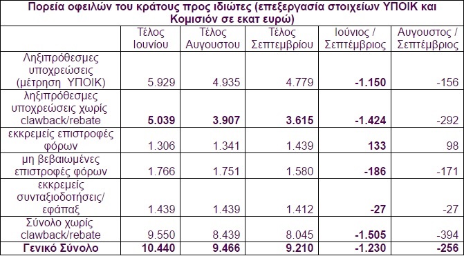 Η "εμφάνιση" νέων οφειλών τον Σεπτέμβριο συνδέεται με υποχρεώσεις που δημιουργήθηκαν τρεις μήνες πριν και δεν αποπληρώθηκαν εγκαίρως. Όσο για τις εκκρεμείς επιστροφές φόρων και συντάξεις/εφάπαξ θα φανεί μέσα στο επόμενο διάστημα πότε και σε ποιόν βαθμό θα αποπληρωθούν αλλά και αν θα υπάρξει "διευκόλυνση" των δανειστών στον τρόπο καταμέτρησής τους στον προϋπολογισμό.