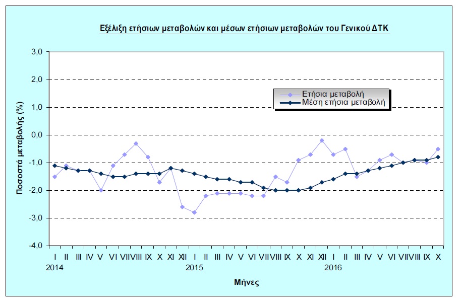 Ο μέσος Δείκτης του δωδεκαμήνου Νοεμβρίου 2015 – Οκτωβρίου 2016 σε σύγκριση προς τον ίδιο Δείκτη του δωδεκαμήνου Νοεμβρίου 2014 – Οκτωβρίου 2015 παρουσίασε μείωση 0,8%, έναντι μείωσης 2,0%, που σημειώθηκε κατά το αντίστοιχο προηγούμενο δωδεκάμηνο.