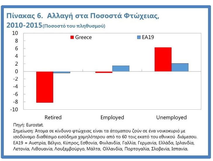 την παράλληλη άρνηση πρόσβασης του πληθυσμού σε βασικές κοινωνικές παροχές δεν είναι ούτε δίκαιη, ούτε κοινωνικά βιώσιμη. Υπάρχουν συχνοί ισχυρισμοί ότι στην Ελλάδα οι συντάξεις πρέπει να παραμείνουν υψηλές γιατί δεν προστατεύουν μόνο το εισόδημα στις μεγάλες ηλικίες, αλλά λειτουργούν επίσης σαν ανεπίσημο κοινωνικό δίχτυ ασφαλείας. Όμως, είναι σαφές ότι οι συντάξεις δεν είναι υποκαθιστούν ένα επαρκές δίχτυ ασφαλείας γιατί αυτή η ειδική διευθέτηση δεν μπόρεσε να αντιμετωπίσει την αύξηση της φτώχειας στις πλέον ευαίσθητες ομάδες. Στην πραγματικότητα, τα στοιχεία δείχνουν ότι οι υψηλές συντάξεις είχαν αντίθετα αποτελέσματα αποτελώντας μια σιωπηρή μεταβίβαση από τα πιο ευαίσθητα μέλη του πληθυσμού εργασιακής ηλικίας στους πιο ηλικιωμένους Έλληνες. Το ποσοστό της φτώχειας στον πληθυσμό εργασιακής ηλικίας, ιδιαίτερα στους άνεργους, αυξάνεται δραματικά από το 2010, ενώ οι συνταξιούχοι είχαν μια αντίστοιχη μεγάλη μείωση των επιπέδων φτώχειας (Πίνακας 6).