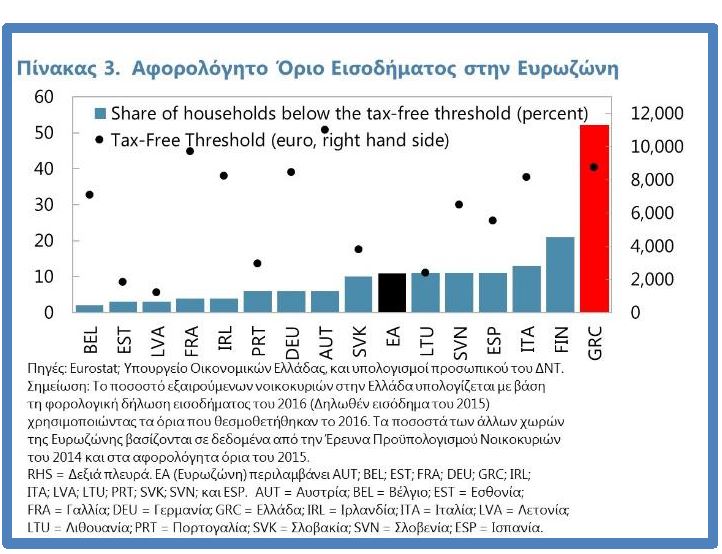Αντίθετα, στην Πορτογαλία και στην Ιρλανδία μόνο το 5 και το 6 τοις εκατό αντίστοιχα της φορολογικής βάσης εξαιρείται (ο μέσος όρος στην υπόλοιπη Ευρωζώνης είναι περίπου 8 τοις εκατό). Σε ονομαστικούς όρους, το αφορολόγητο όριο των 8.750 ευρώ είναι ανάμεσα στα πιο υψηλά της Ευρωζώνης, υψηλότερο και από αυτά της Γερμανίας, της Ιταλίας ή της Ισπανίας. Αυτό συνεπάγεται επίσης ότι η φορολογία είναι εξαιρετικά ασύμμετρη στην Ελλάδα, με το υψηλότερο δεκατημόριο των μισθωτών να αναλογεί σχεδόν στο 60 τοις εκατό των εσόδων από τη φορολογία του εισοδήματος.