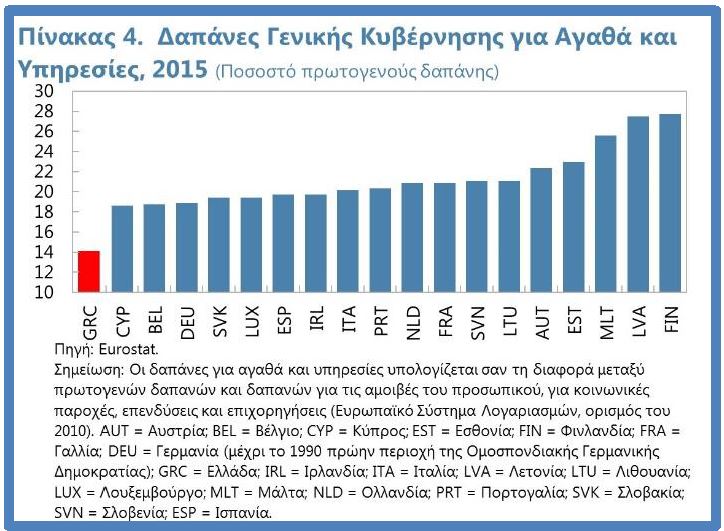 Επιπλέον, η εξάρτηση των Ελληνικών αρχών από τη συμπίεση των διακριτικών δαπανών δεν είναι αξιόπιστη. Για παράδειγμα, τα τελευταία χρόνια οι δαπάνες για αγαθά και υπηρεσίες έχουν περικοπεί δραματικά και σύμφωνα με τα Ευρωπαϊκά πρότυπα τώρα έχουν φτάσει σε εξαιρετικά χαμηλά επίπεδα (Πίνακας 4).