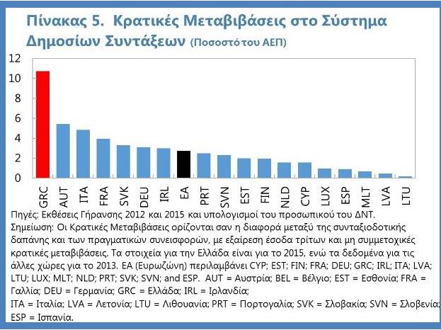 Ταυτόχρονα, καθώς οι βασικές δημόσιες υπηρεσίες συμπιέζονται σε μη βιώσιμα επίπεδα, οι συνταξιοδοτικές δαπάνες παραμένουν δυσβάσταχτες. Η Ελλάδα κατά μέσο όρο καταβάλει ονομαστικές δημόσιες συντάξεις που είναι παρόμοιες με αυτές της Γερμανίας παρά το γεγονός ότι έχει πολύ χαμηλότερη παραγωγικότητα. Αυτό το καταφέρνει μόνο με δημοσιονομικές μεταβιβάσεις στο σύστημα που είναι τετραπλάσιες από αυτές του μέσου όρου της Ευρωζώνης (Πίνακας 5).