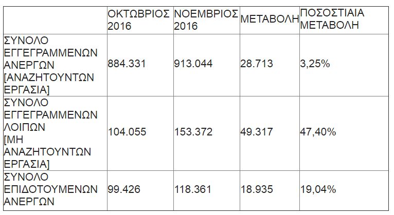 - Το σύνολο εγγεγραμμένων ανέργων που αναζητούν εργασία σημείωσε άνοδο 3,25% το Νοέμβριο του 2016 σε σχέση με τον προηγούμενο μήνα