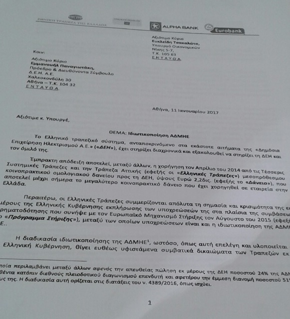 Αναλυτικά το κείμενο της επιστολής με ημερομηνία 11 Ιανουαρίου, που συνυπογράφουν ΕΤΕ, Πειραιώς, Alpha και Eurobank αναφέρει: