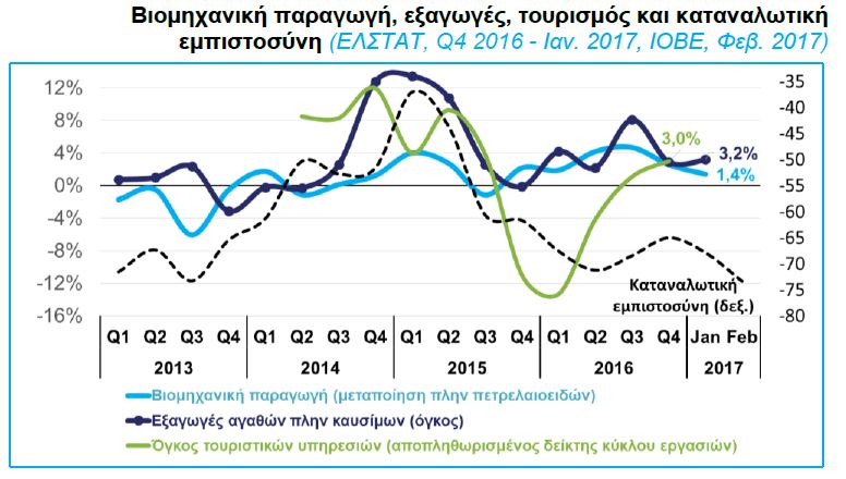"Από την πλευρά της προσφοράς, πάντως, η βιομηχανική παραγωγή, οι εξαγωγές χωρίς καύσιμα, οι λιανικές πωλήσεις και ο τουρισμός στο 4ο τρίμηνο του 2016 συνεχίζουν την ανοδική τους πορεία με ικανοποιητικούς ρυθμούς, ενώ τον Ιανουάριο του 2017 η βιομηχανική παραγωγή και οι εξαγωγές ενίσχυσαν περαιτέρω τη δυναμική τους.