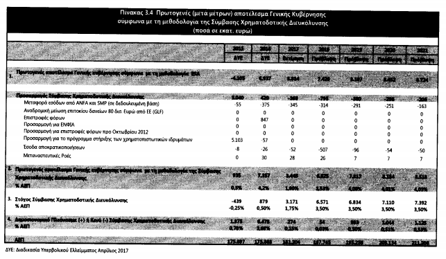 Στο κείμενο του Μεσοπρόθεσμου, αναφέρεται ότι τα πλεονάσματα όχι μόνο θα φτάσουν αλλά και θα ξεπεράσουν το στόχο του 3,5% του ΑΕΠ. Θα τον υπερβούν κατά 0,5% του ΑΕΠ και υπολογίζονται στο 4% του ΑΕΠ περίπου από το 2019 και μετά.